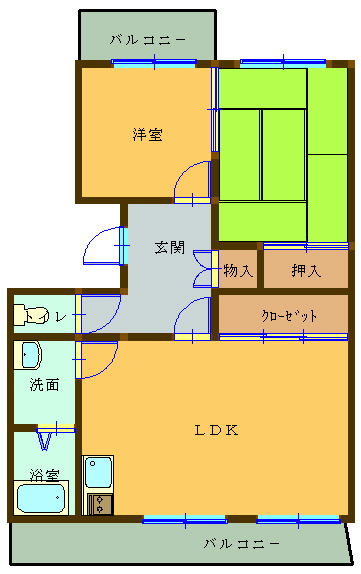 間      取 2LDK  (和室 6畳 洋室 6畳 LDK12畳 ベランダ有り)