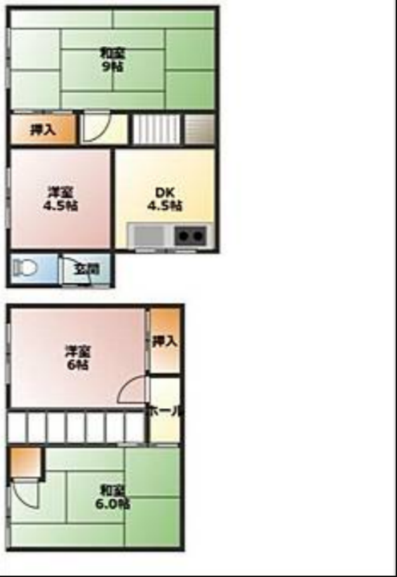 4DK (1F 和9畳/洋4.5畳/DK4.5畳 2F 和6畳:洋6畳) |