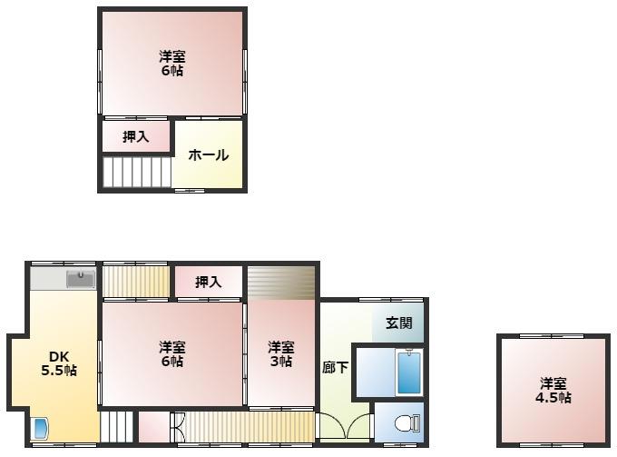 3DK (主屋:DK5.5帖CF、洋室6帖フローリング×2、洋室3帖フローリング 離れ:洋室4.5帖フローリング) |